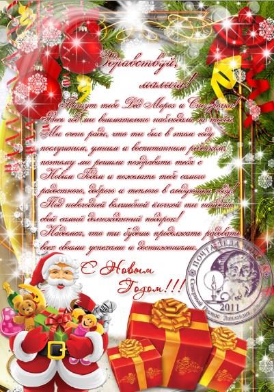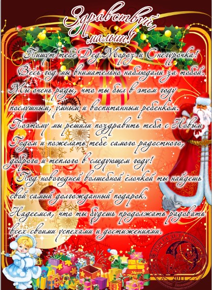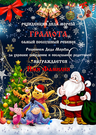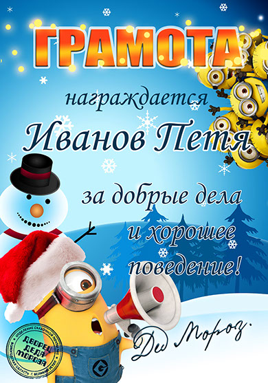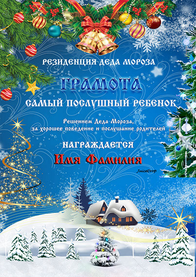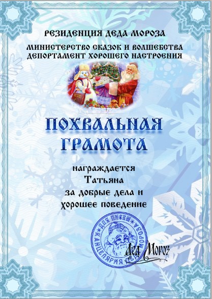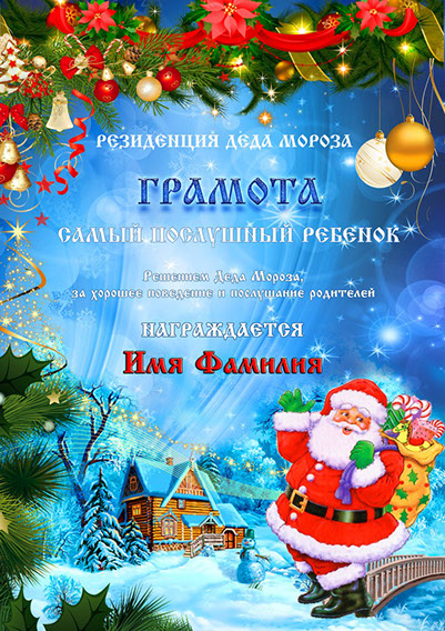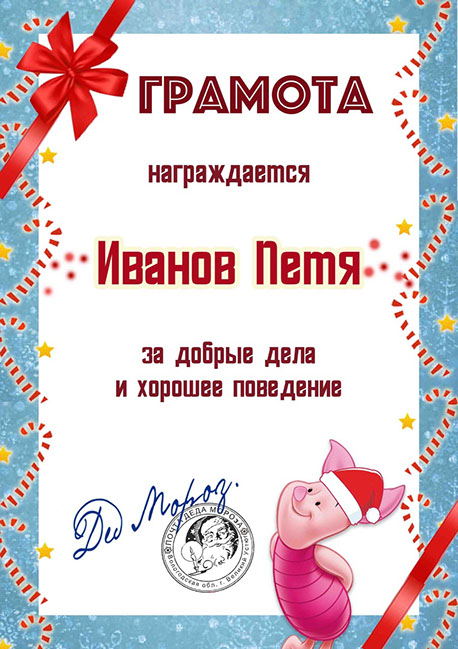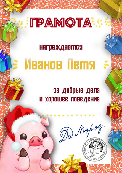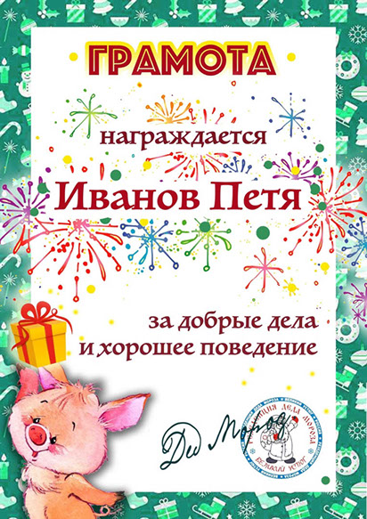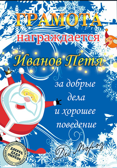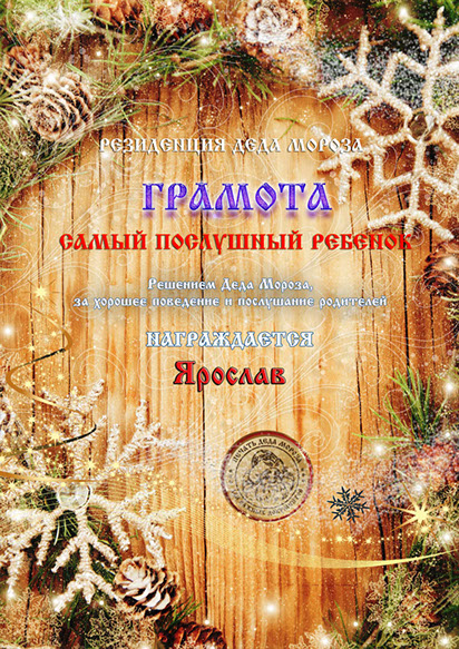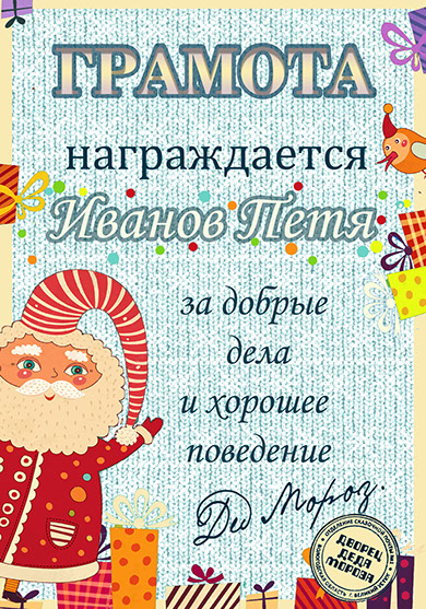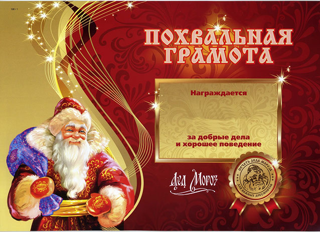 - Именная грамота от Деда Мороза за «хорошее поведение» (отправляется по электронной почте)