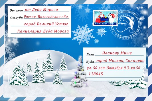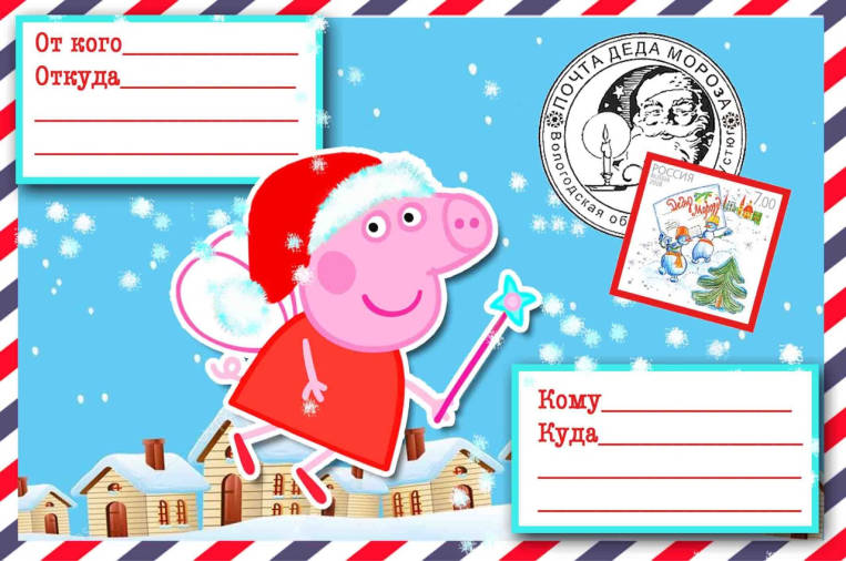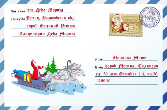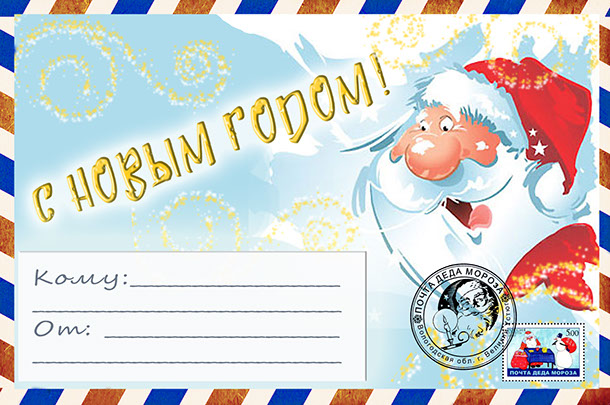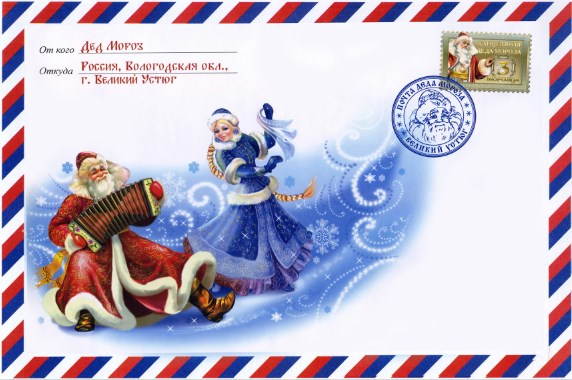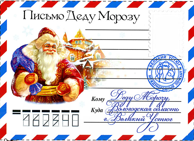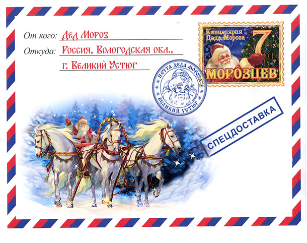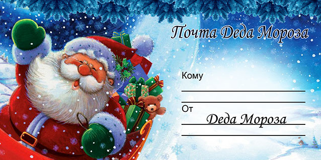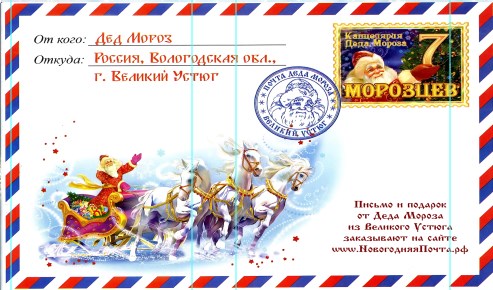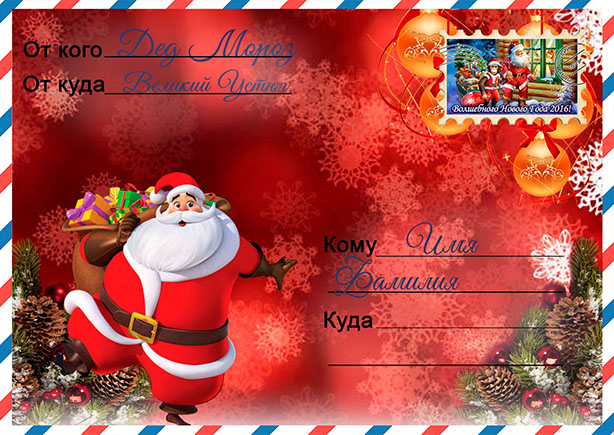 - Получение именного письма от Деда Мороза в красочном конверте, отправленного «Почтой России»