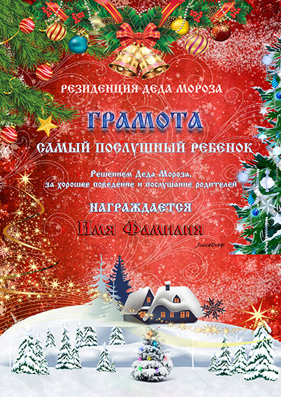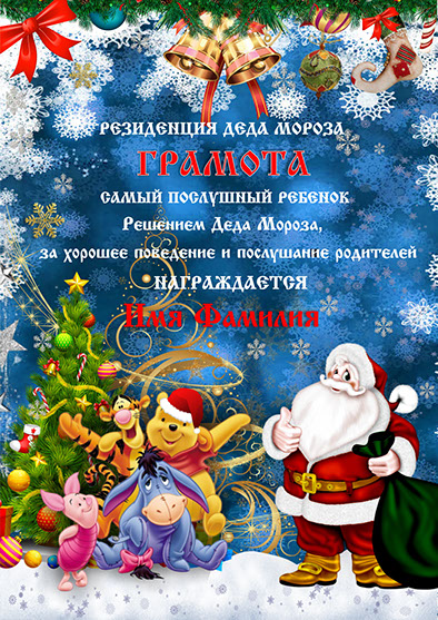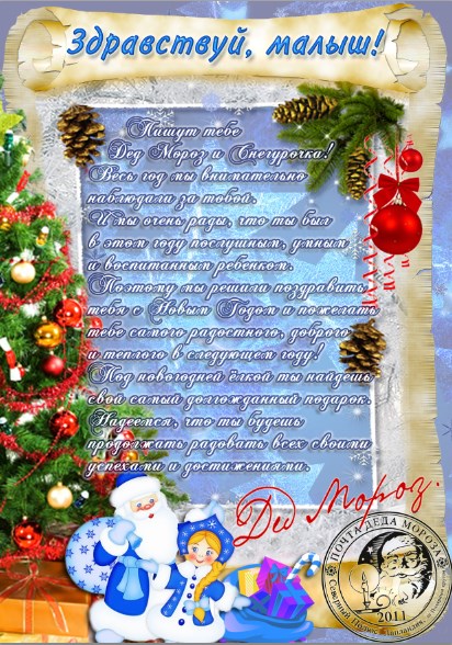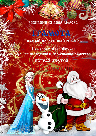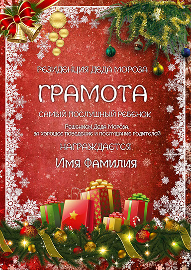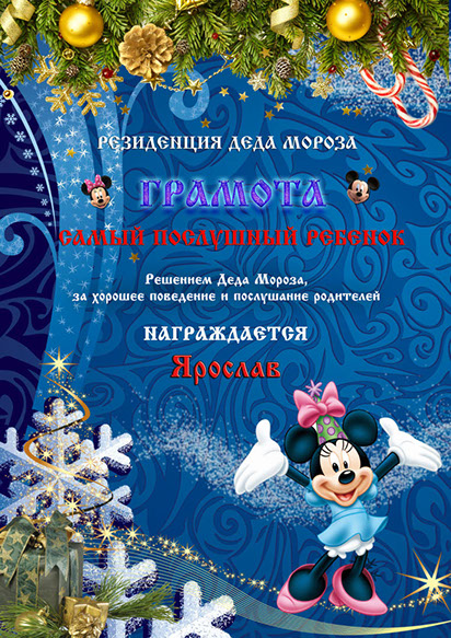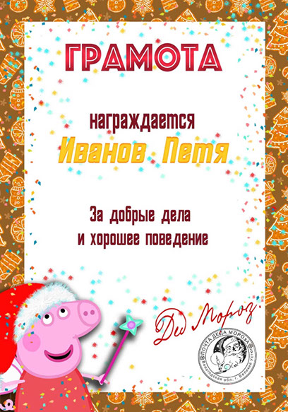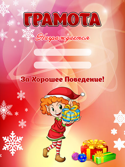 - Именная грамота от Деда Мороза за «хорошее поведение» (отправляется по электронной почте)