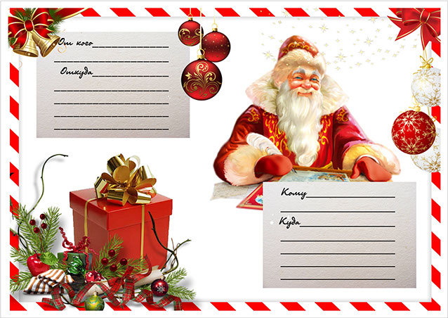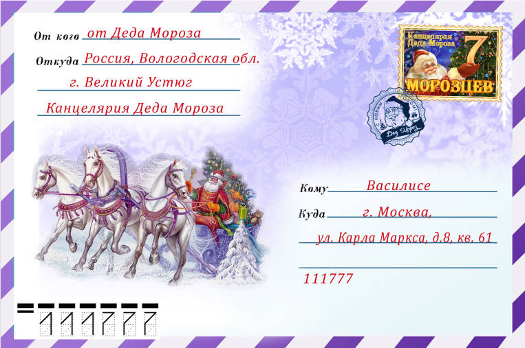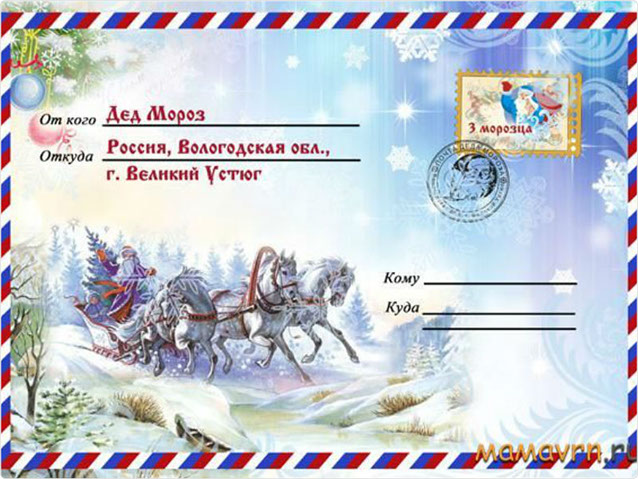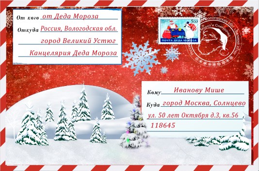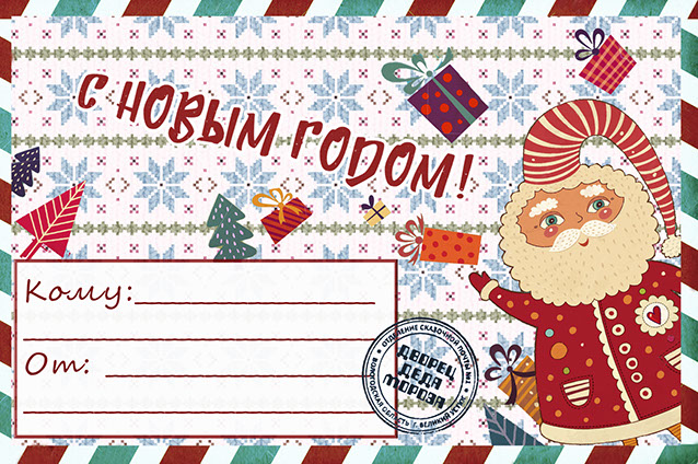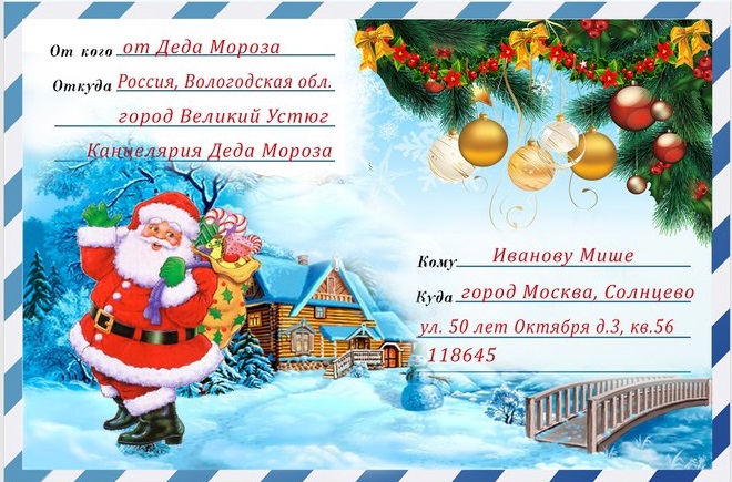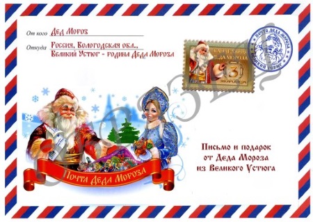 - Получение именного письма от Деда Мороза в красочном конверте, отправленного «Почтой России»